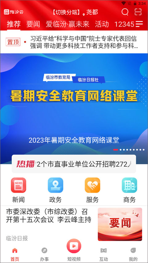 1、打开临汾云app,在首页中点击进入暑期安全教育网络课堂;