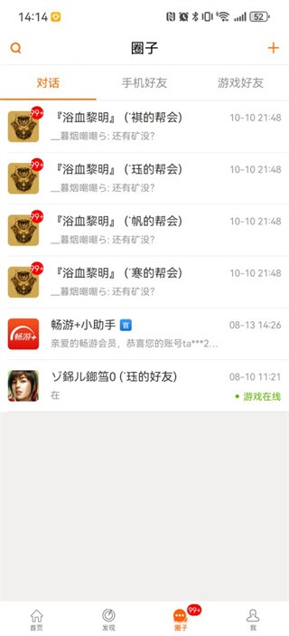 点击圈子,绑定了账号的用户可以在圈子中看到帮会的一些聊天记录,也可发布一些消息让游戏里面的玩家看见,但是游戏中的标识会显示畅游+发布。