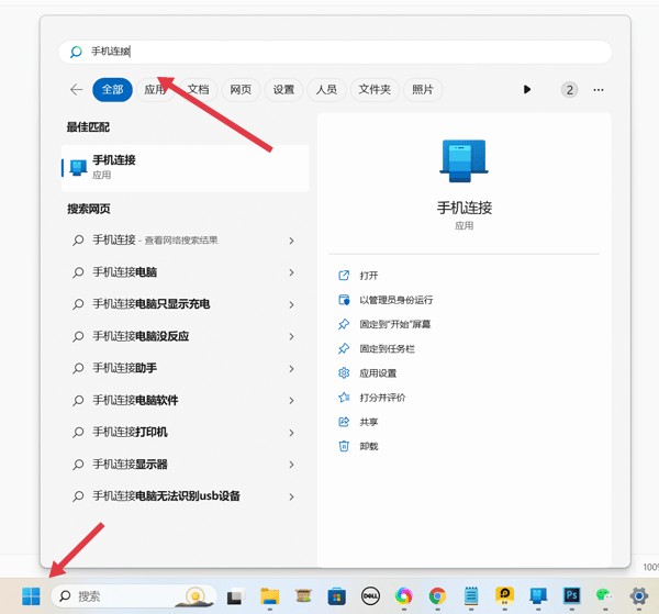 在电脑上,点击“开始”按钮,搜索“连接手机”并打开该应用。