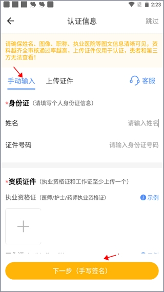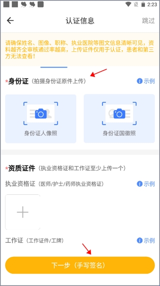3、一种是上传证件照片,填写完认证信息后,点击下一步。