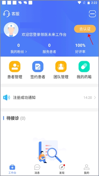 1、输入手机号和验证码进入软件后,点击菜单栏“工作台”的“去认证”。