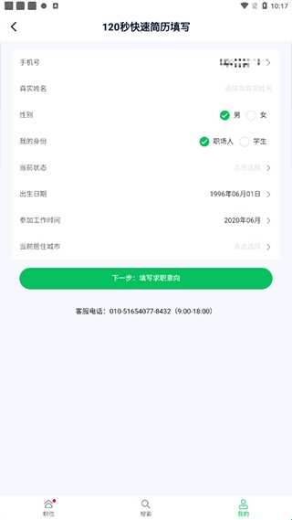 3、照要求填写个人信息,点击下一步,选择求职意向即可。