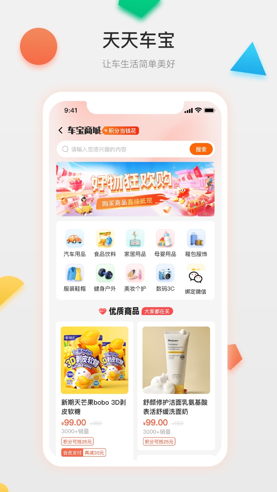 4、打开车宝商城,可以购买日用百货和软件联名产品;