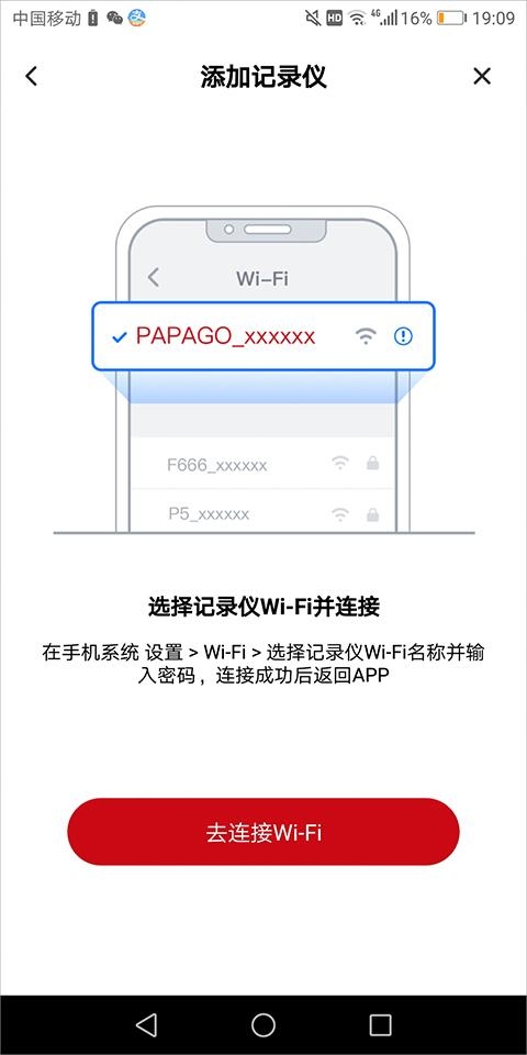 4、用户只需点击【去连接wifi】,手机会跳转到用户手机的WiFi设置页面上,用户找到记录仪wifi并输入密码连接即可