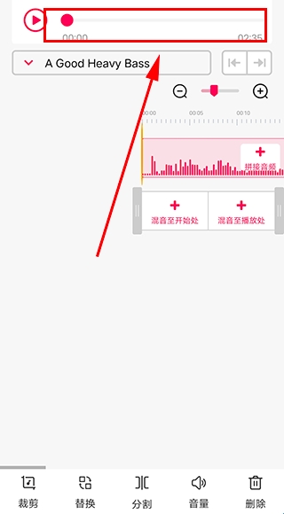 4、点击右下方“裁剪”可对音频进行裁剪,通过锚点可调整裁剪的位置,当然还可以通过时间选择器进行精确的调整