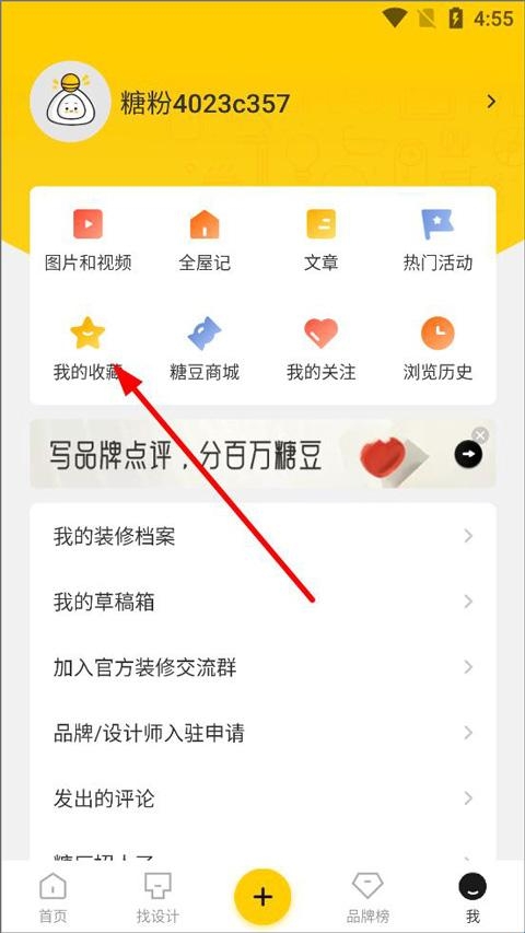2、进入我的页面,用户可查看自己发布的图片、视频、全屋记、文章、热门活动等,点击我的收藏;