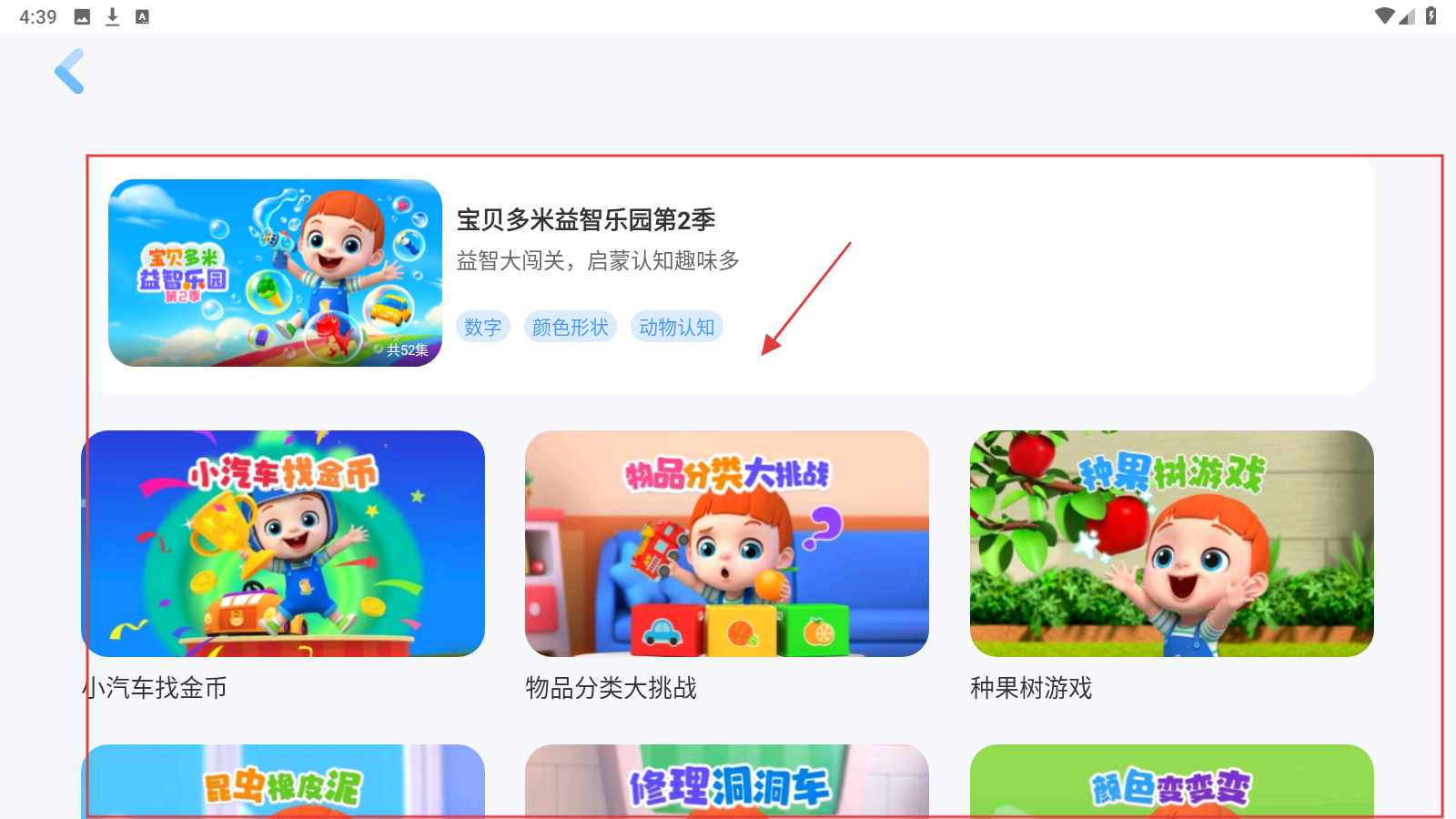 2、进入专题页,选想看动画(如《宝贝多米益智乐园第2季》),查看剧集列表。