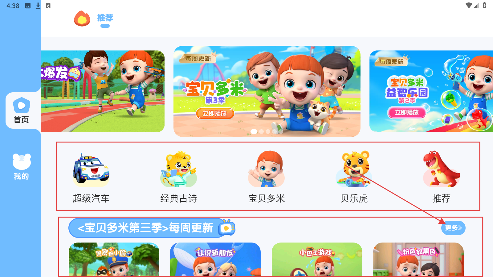 1、在首页选【宝贝多米】分类,点对应专题【更多】,浏览系列动画。