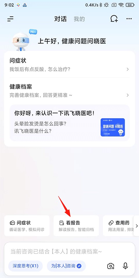 如果你正在与讯飞晓医进行对话,也可以直接在对话页面点击“看报告”来上传体检报告。