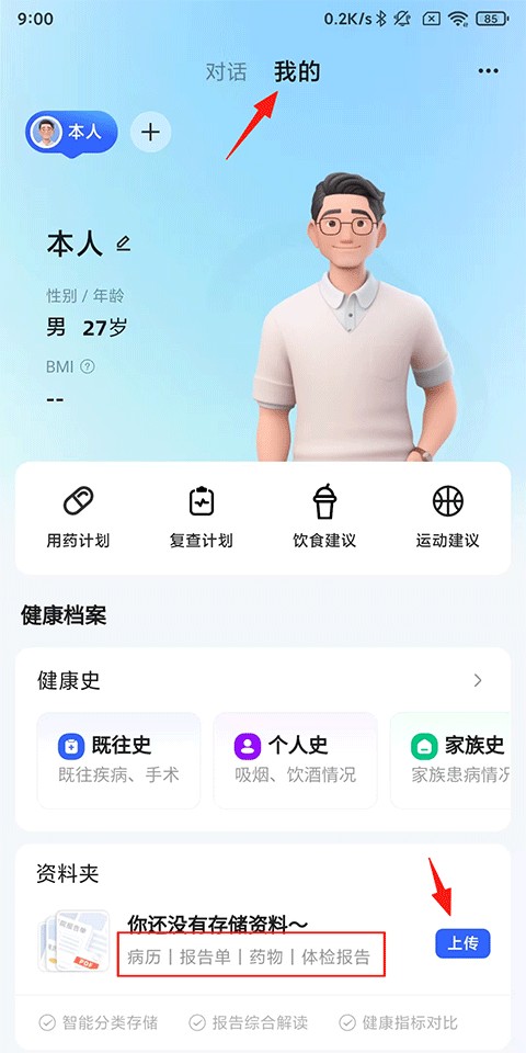 点击右下角的“我的”,然后在“资料夹”下找到“上传”选项。这里支持上传多种类型的医疗文件,包括病历、报告单、药物以及体检报告。