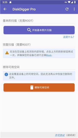 2、请注意:若您的设备未进行植根操作,此应用程序仅能针对已删除的照片展开“有限”扫描。要实现对其他类型文件的搜索,以及对设备整个内部存储器的搜索,设备必须获取root权限。在未root的设备上,该应用程序仅能恢复其在设备缓存及缩略图目录中所找到的低分辨率版本照片。