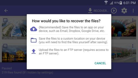 2、您可以将恢复的文件直接上传或通过电子邮件发送。该应用程序还允许您将文件上传到 FTP 服务器,或将它们保存到设备上的不同本地文件夹中。