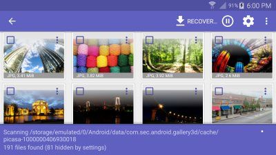 DiskDigger Pro的使用方式十分简单,你只需在安卓设备中选择要恢复的区域,然后点击“扫描”键。恢复过程会持续几秒钟到几分钟不等,具体时间取决于扫描区域的大小。扫描过程中,我们可以看到已经被程序发现的图片,然后点击恢复即可保存。