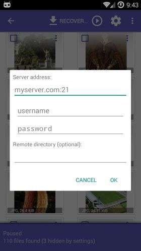 最后一种方式,能让您把可恢复文件上传至FTP服务器。要实现这一点,您得访问在线的FTP服务器,凭借正确的凭据来访问服务器并完成上传操作。DiskDigger Pro会弹出一个对话框,您可在此输入FTP服务器的主机名,以及登录服务器所需的用户名和密码。