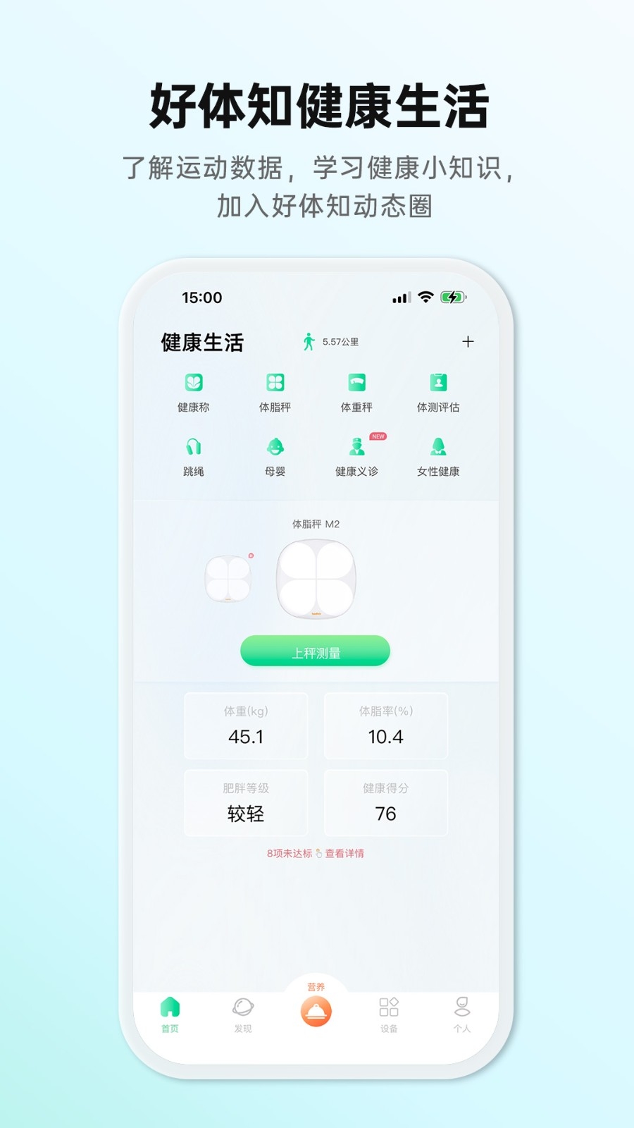 好体知是一款非常专业的称体重的软件。该软件上主要是通过软件上与体脂秤进行连接,在用户们进行称重的时候,该数据可以直接的在软件上进行反应非常的方便,用户们可以直接的通过软件进行了解自己的体重和身体健康的数据,操作非常的简单,对于自己的身体健康进行分析。
