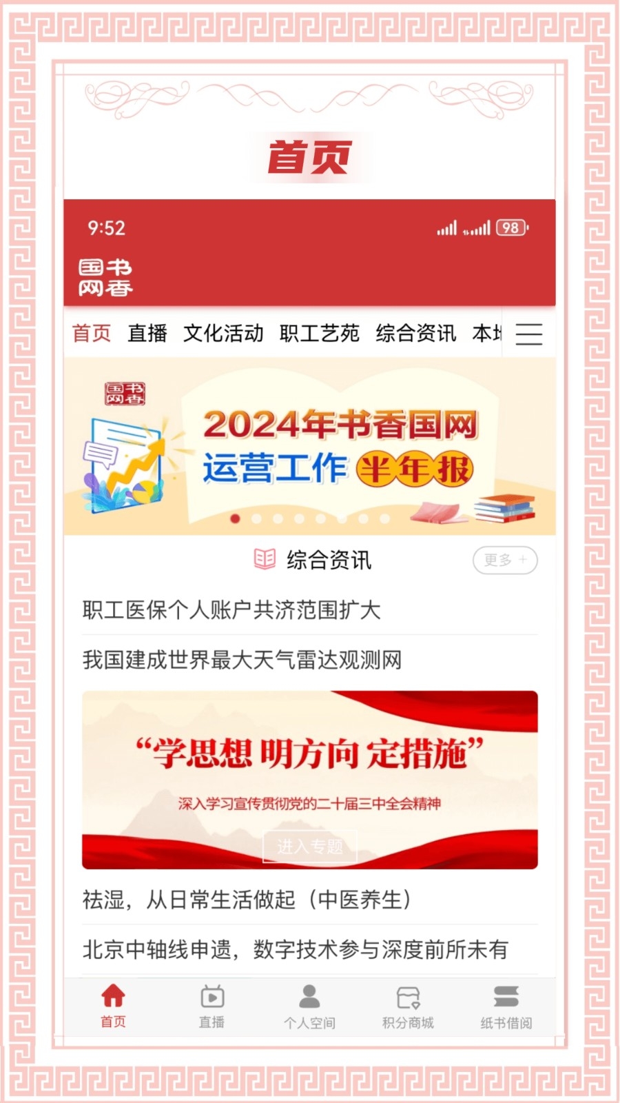 1、打开书香国网app安卓版,进入个人空间获取移动借阅卡