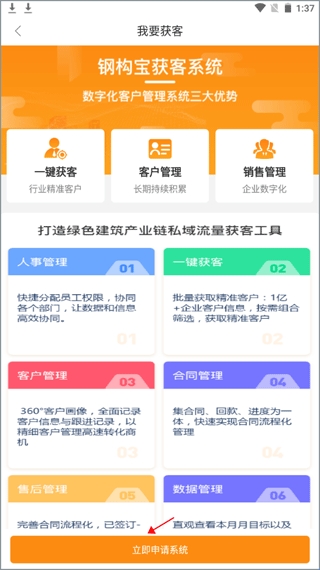 2、就可以看到获客系统的功能介绍,如何开启这个系统,就可以使用管理客户、管理合同等功能了,点击下方的“立即申请系统”。