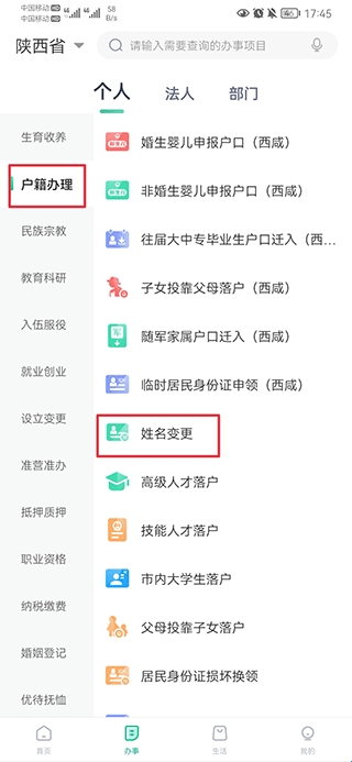 一、打开秦务员陕西政务服务app,在下方办事中的户籍办理找到姓名变更。