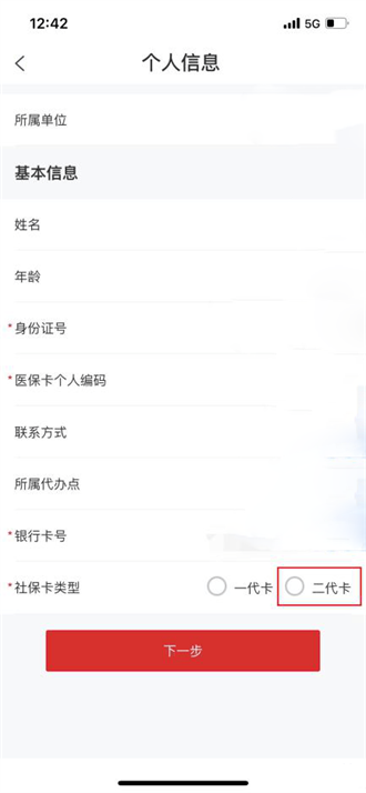 5、填写好相关的社保卡信息之后,勾选二代卡,点击下一步。
