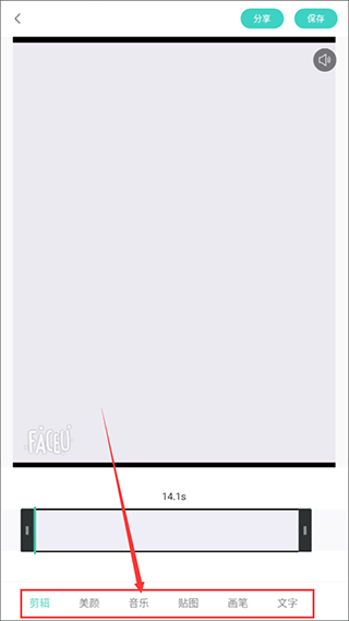 3、视频拍摄完成后,我们可以对视频进行编辑,自由剪辑、添加美颜、贴图、文字等等,想要拍带音乐的视频只需点击“音乐”进入;