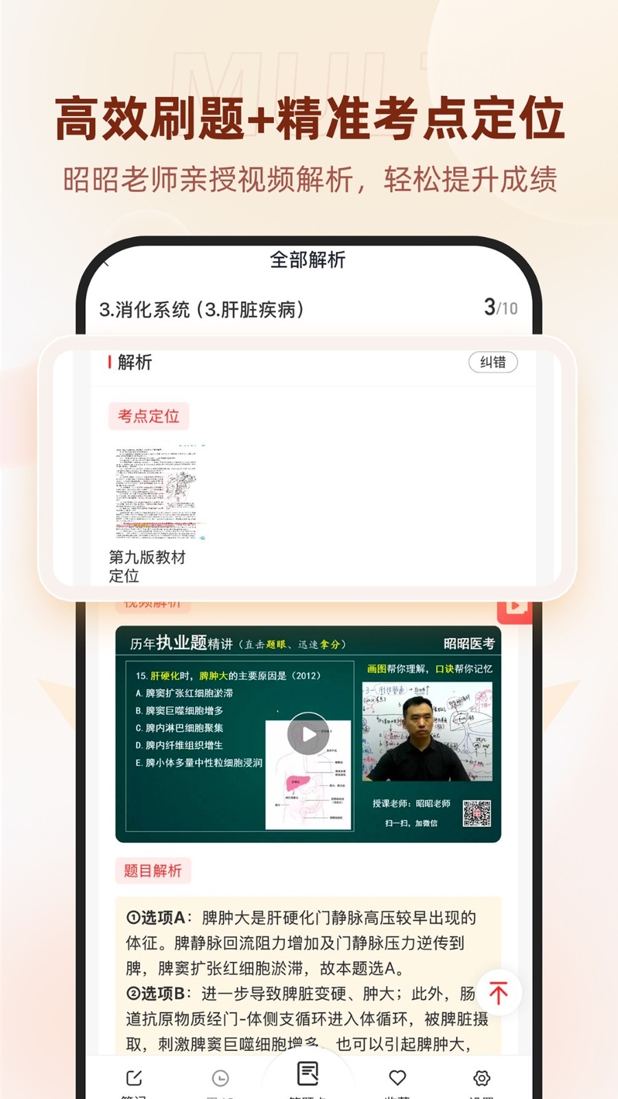 昭昭医考由昭昭老师主讲,画图讲解知识点,进口考纲,通俗易懂,深受广大考生赞誉。此款软件由昭昭医考团队最新研发,涵盖昭昭老师最新讲课视频,让你可以随时随地学习提分。昭昭老师,在医学界呗誉为京城四大名师之一,具有多年的教学经验,授课特点:画图讲解,图文结合,紧扣考纲,师资力量雄厚,班级管理老师认真负责,班级由十位代班老师及技术组成员,为广大考生提供更优质的服务,每年的教材随着大纲的变动及时更新,各种资料一应俱全,包括技能和笔试资料,后期有面授和押题精讲,是学员在最后冲刺阶段信心满满,顺利圆医考梦想。