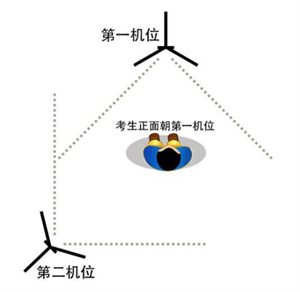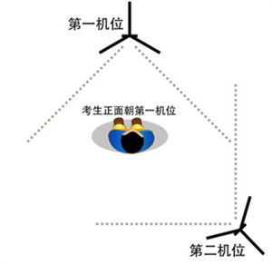 模拟考试/正式考试采用双机位,部分专业在考试系统中有示范视频或主机位示范图片,考生可按示范要求进行机位摆放,凡未做特别规定的,双机位摆放参考上图。