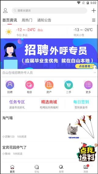 2、然后会看到首页、论坛、发现、消息四个板块,在首页中有着资讯、周热门、通知公告等服务,以及招聘、相亲、房产、二手、任务、商城、签到等功能;