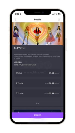 接下来,它会展示不同数量使用券对应的价格,一张使用券价格为3.99美金(约110 - 120台币),两张使用券价格是6.99美金等。需要注意的是,一张Ticket仅能用于一位艺人,且会自动每月续订。在此处,请直接点击「购买使用券」。