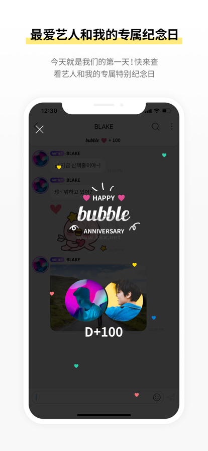 他一开始会先发送一则通用的欢迎消息,随后便继续等待艺人发送消息。在此期间,你也能够发送文字消息或者表情符号。上面显示的「Bubble +1」代表纪念日天数,第一天显示 +1,第二天则显示 +2 。