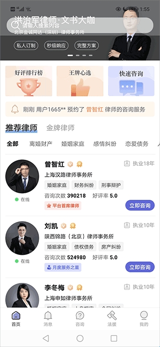 1、打开软件,在首页找到并点击推荐律师或金牌律师中的任意一位自己中意的律师;