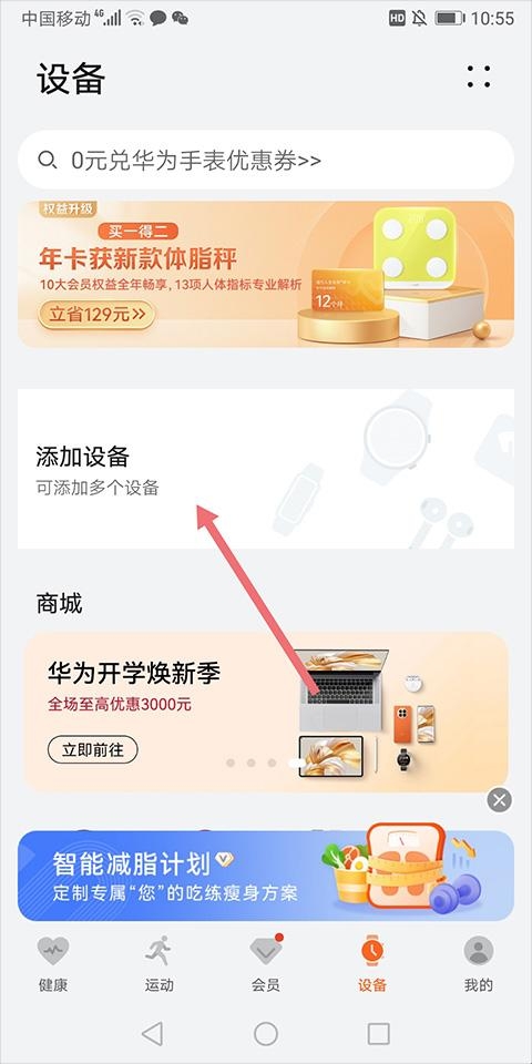 2、开启手机蓝牙后,将手表靠近手机,等待手机蓝牙匹配到设备时,在运动健康app上的设备页面中点击【添加设备】将手表设备进行配对连接