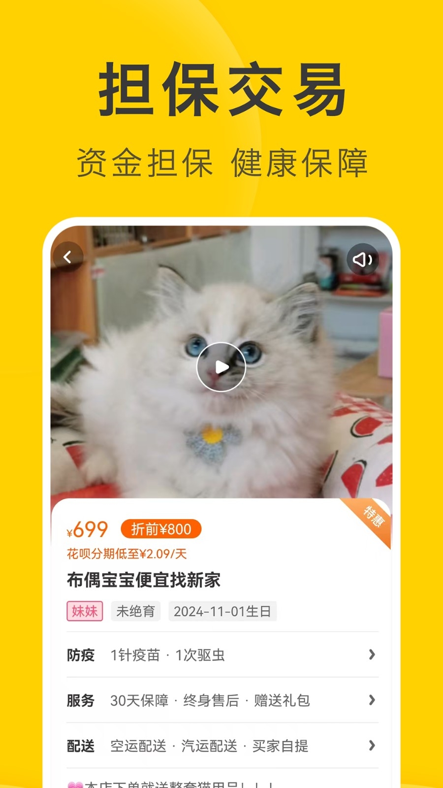 1、担保交易,用户们在购买的时候会有一定的资金担保,保障宠物们的健康情况。