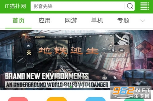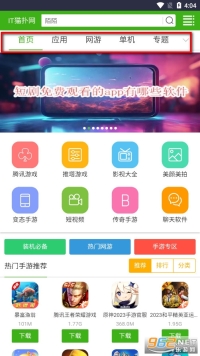 1、打开IT猫扑网app,就像在使用网页版那样,分为了首页、 应用 、网游、单机、专题等多个不同分类。