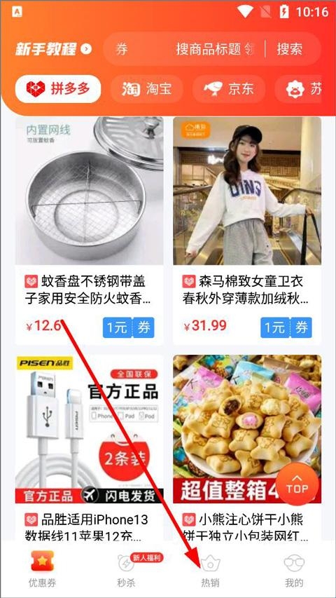 1、打开蚁淘生活app,登录进入优惠券主页,用户可在优惠券页面查找各个平台优惠券(拼多多、淘宝、京东、苏宁等)并购买商品,点击热销;