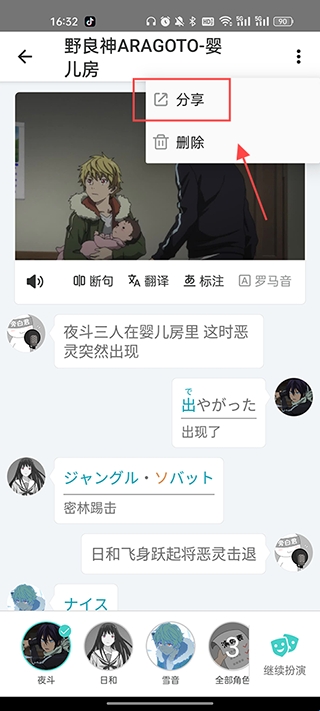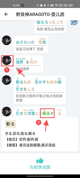 2、选择你喜欢的动漫篇章开始录制,录制中点击头像可以反复听发音;点击词语有语义解释;点击话筒上划是取消,再次点击是重新录制