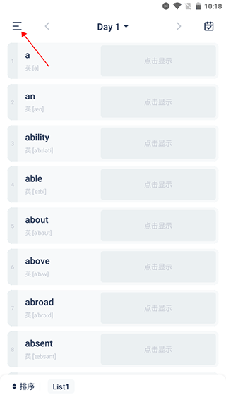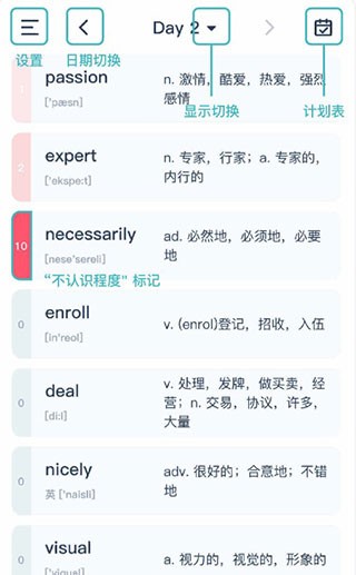 学习页面,进入到Day2,中间显示当前List的所有单词,如图所示: