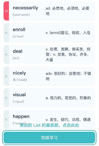 当完成一个List的学习后,可点击List底部的“完成学习”按钮,如以下图示,以此完成打卡记录。
