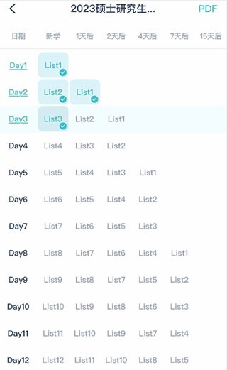 学习计划列表中,每个Day的单词学习均包含记忆与复习两个部分。只有当当前Day的记忆和复习任务都完成后,方可进入下一个Day。打勾意味着已完成记忆/复习。例如,从下图可见,Day3已完成list3的记忆,不过还需复习list1和list2,之后才能开启Day4的学习。