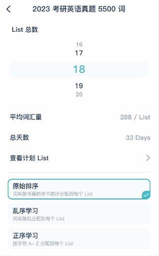 若选择2025考研英语真题5500,就会进入[学习计划表设置]页面。在此页面,可通过滚动数字轮对List总数加以调整,将单词词库平均划分,从而得出平均词汇量与总天数。接着选择乱序学习方式,便可生成你的学习计划表。最后点击“开启你的单词记忆之旅”按钮,即可开始单词学习。