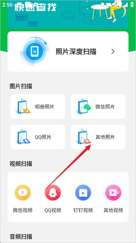 打开手机数据大师兄App后,在首页你会看到多种图片扫描选项,比如相册照片、微信图片、QQ图片等。这里,我们以“其他照片”为例,点击该选项以开始扫描过程。