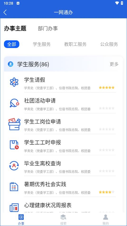 3、点击底部导航栏的搜索,在搜索框内输入学生请假,检索出学生请假业务。点击学生请假业务。