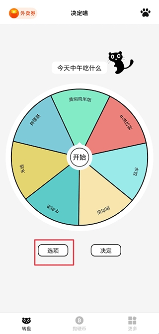 1、打开决定喵app,在转盘界面中点击选项