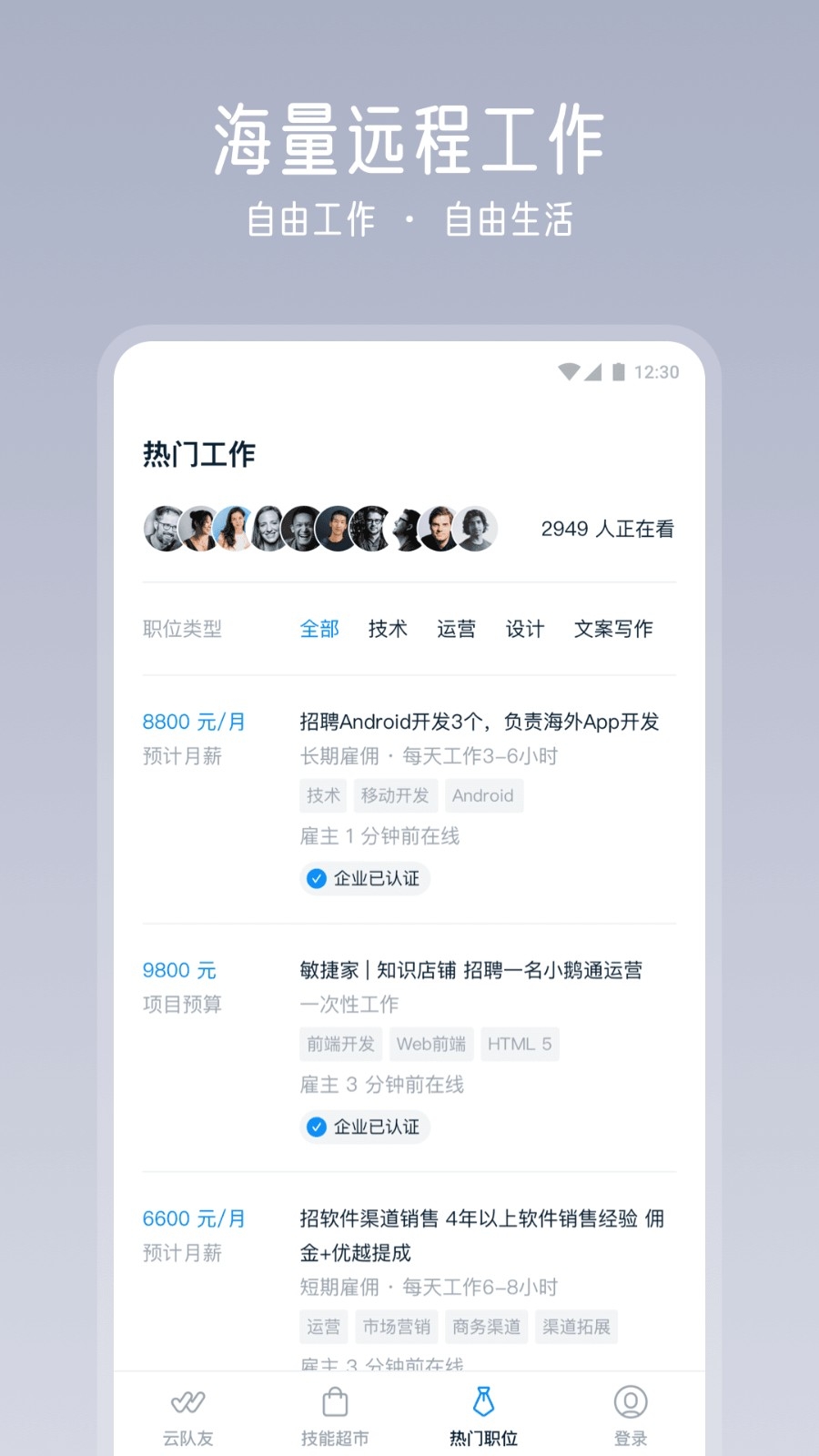 云队友是一款非常专业的远程的工作软件。在软件上面具有非常多的实用性的工作,用户们可以在软件上进行查找各种各样的远程工作,对于工作的内容和薪资在软件上都具有,而且软件上的工作都不需要线下办公,可以直接进行远程办公非常的方便,迅速的找到自己的心仪的工作。