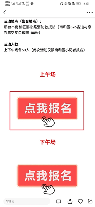 三、进入后往下滑,选择上午场或下午场后,点击点我报名
