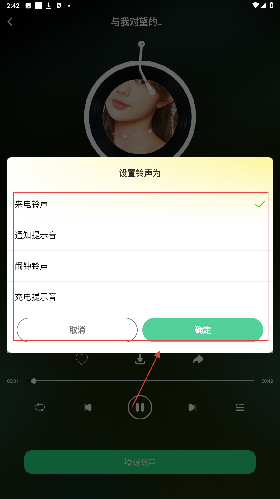3、在设置弹窗选铃声类型,如【来电铃声】,点【确定】完成设置。