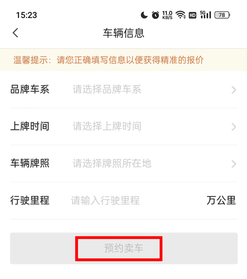 在卖车页面,你需要填写一些基本的意向信息,包括你的地址和手机号。确保信息准确无误后,点击提交。