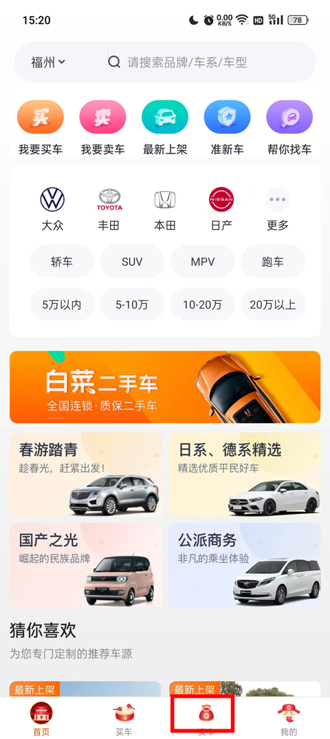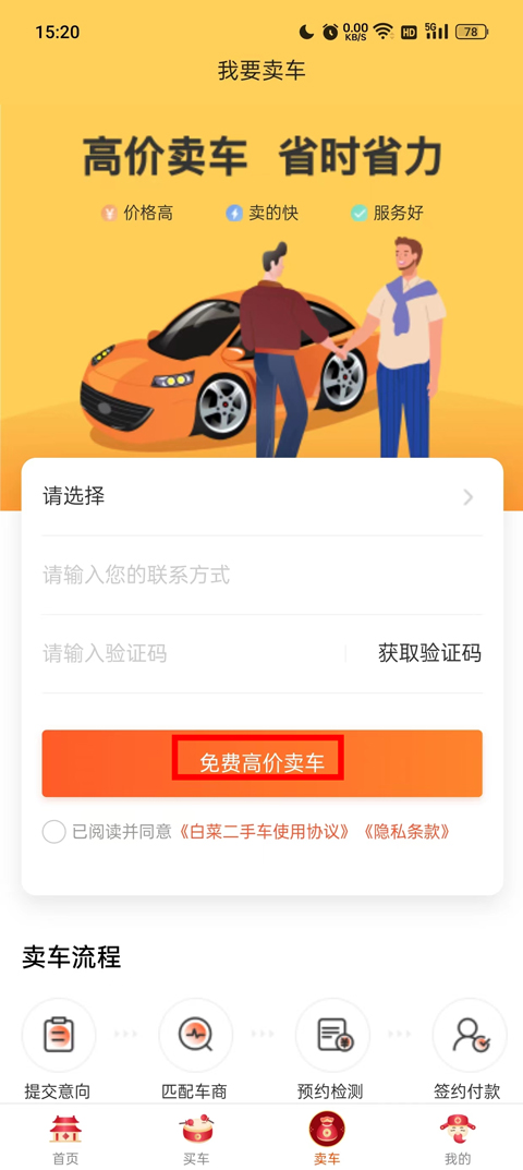 在软件首页或下方导航栏中,找到并点击【卖车】页面,进入卖车流程。