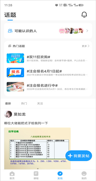 另外,你还可以点击“发现”栏,发帖与其他用户交流会计学习经验,互相学习,共同进步。