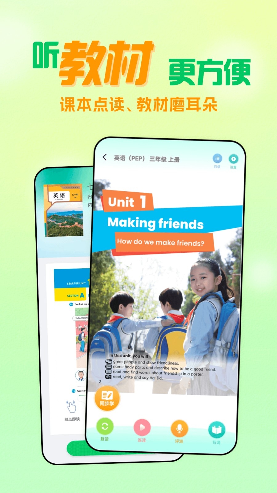 1、提供与人教版英语教材同步的口语课程内容,帮助学生课后有效练习口语表达。