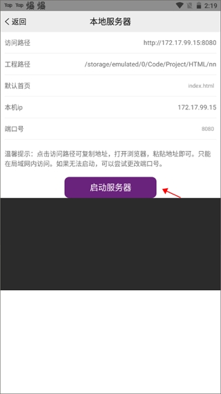 3、确认各项配置参数无误,点击启动服务器。点击访问路径即可复制到剪切板。